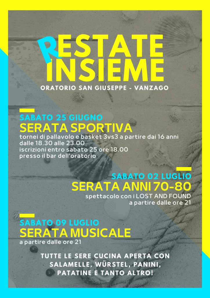 (R)ESTATE INSIEME! Posted on 26 giugno 2022 by admin Ecco un programma per passare qualche serata insieme in oratorio a Vanzago! Vi aspettiamo numerosissimi!! Condividi: Condividi su X (Si apre in una nuova finestra) X Condividi su Facebook (Si apre in una nuova finestra) Facebook Mi piace Caricamento...