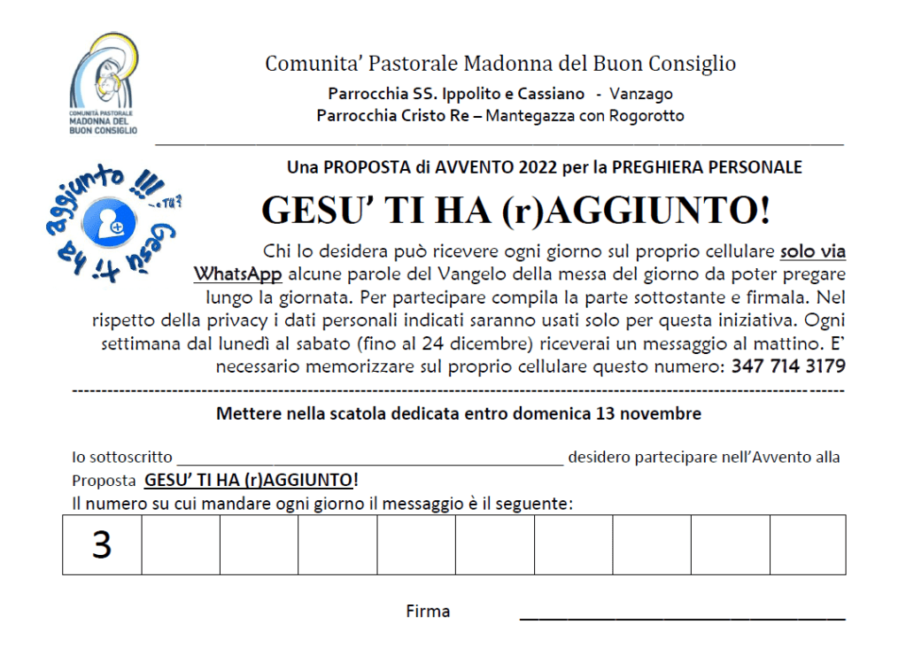 Gesù ti ha (r)aggiunto! Posted on 3 novembre 2022 by admin Clicca sull’immagine sottostante per scaricare il pdf da stampare e compilare Condividi: Condividi su X (Si apre in una nuova finestra) X Condividi su Facebook (Si apre in una nuova finestra) Facebook Mi piace Caricamento...