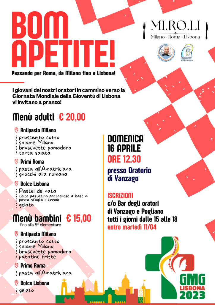 GMG Lisbona 2023 Posted on 28 marzo 2023 by admin BOM APETITE! I nostri giovani vi aspettano per un gustosissimo pranzo! Affrettatevi ad iscrivervi per non perdere il posto! Clicca sull’immagine per visualizzare il menù Condividi: Condividi su X (Si apre in una nuova finestra) X Condividi su Facebook (Si apre in una nuova finestra) Facebook Mi piace Caricamento...