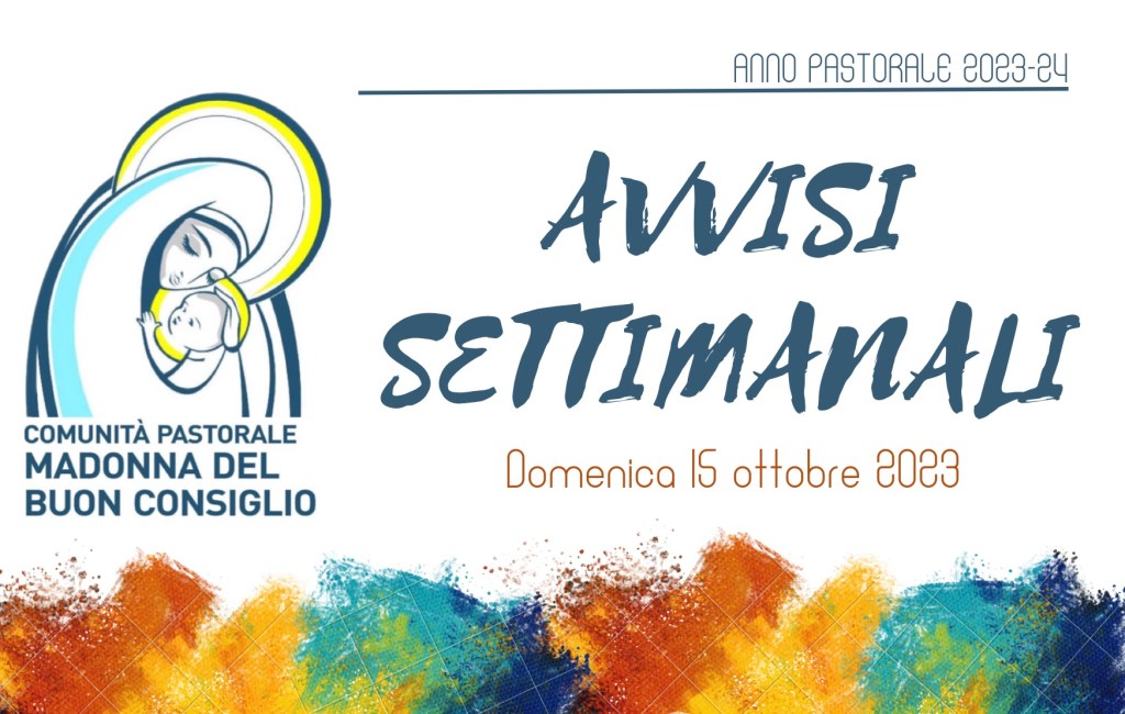 Avvisi: 15 ottobre 2023 Posted on 14 ottobre 2023 by admin Cliccando sull’immagine sottostante è possibile aprire il foglio degli avvisi settimanali, valido da domenica 15/10/2023 a domenica 22/10/2023. Condividi: Condividi su X (Si apre in una nuova finestra) X Condividi su Facebook (Si apre in una nuova finestra) Facebook Mi piace Caricamento...