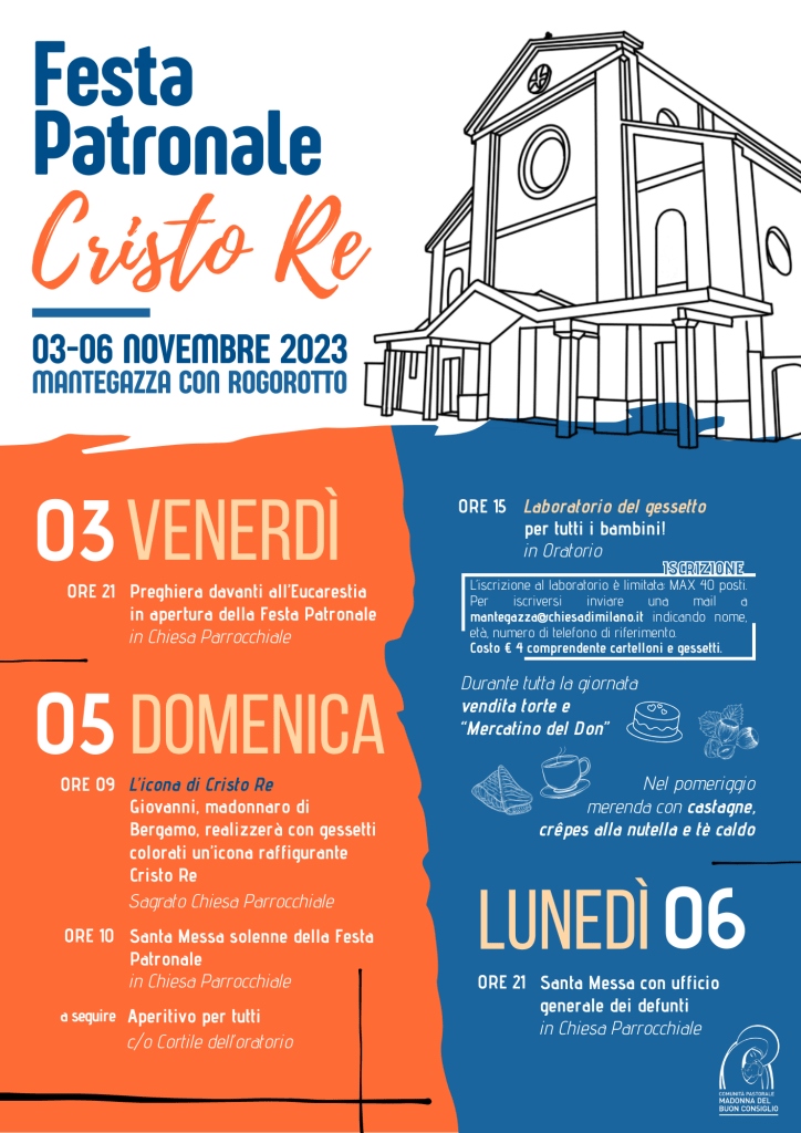 Festa Patronale di Cristo Re Posted on 28 ottobre 2023 by admin Anche quest’anno la nostra Comunità si sta preparando a vivere la Festa Patronale di Cristo Re nella Parrocchia di Mantegazza. Siamo tutti invitati a partecipare! Clicca sull’immagine per scaricare il programma Condividi: Condividi su X (Si apre in una nuova finestra) X Condividi su Facebook (Si apre in una nuova finestra) Facebook Mi piace Caricamento...