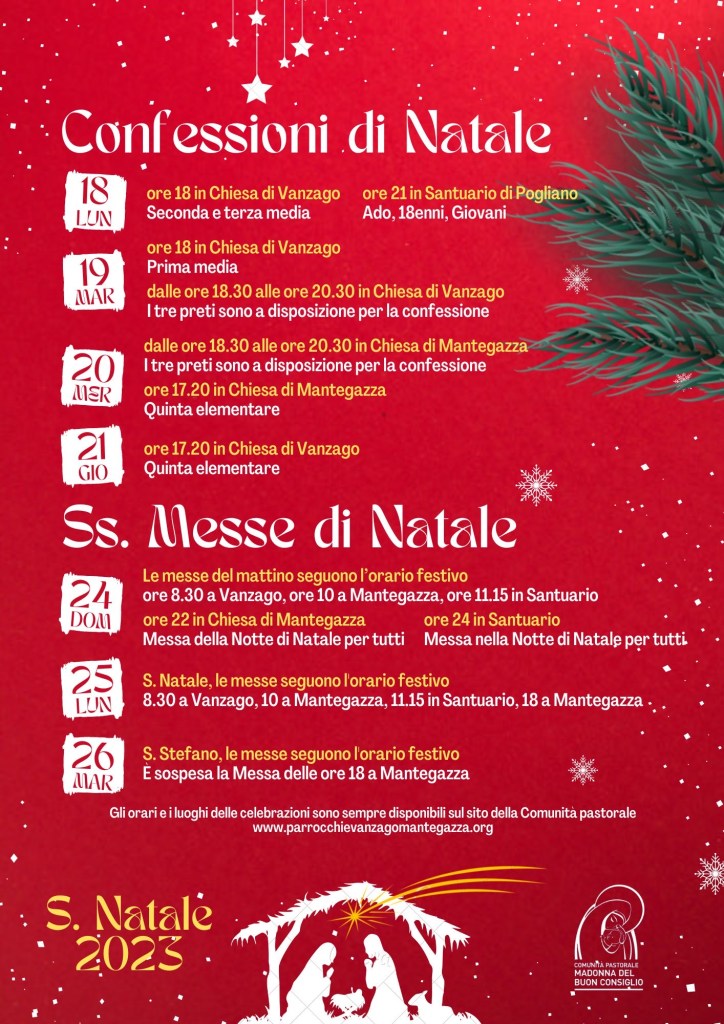 Santo Natale 2023 Posted on 20 dicembre 2023 by admin Clicca sull’immagine per consultare il calendario riportante giorni e orari relativi alle confessioni e alle prossime celebrazioni. Un caro augurio a tutti! Condividi: Condividi su X (Si apre in una nuova finestra) X Condividi su Facebook (Si apre in una nuova finestra) Facebook Mi piace Caricamento...